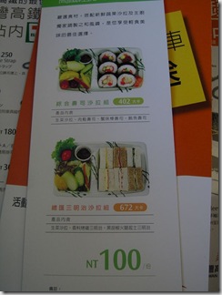 我說過了,這不是我第一次搭高鐵,不過是第一次坐在第十二車廂。現在高鐵有推出了餐點的服務,在用餐時間有輕食可以購買。有兩種餐點,都是一百塊一份,看起來是挺不賴的,再加上高鐵列車上的服務人員都很年輕,也不錯正,光是跟他們買東西就是小小的享受啦!!