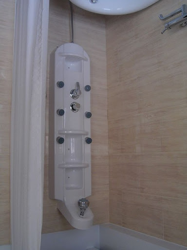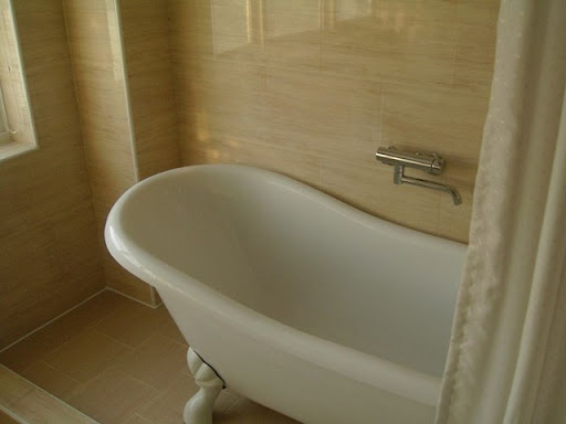 再來就是他浴室裡面的浴簾不夠長!!如果站在浴缸裡面洗澡的話,位置會變得比較後面,而不夠長的浴簾就失去了功用,沖澡的水就很輕易的濺到外面的地板了,廁所的地板就濕答答的了!