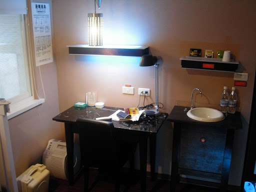 推開大門,可以看到左手邊擺了三台PC跟印表機,右手邊有一排的桌椅,另外還有咖啡機耶!因為櫃臺正在講電話,所以請一位美女讓我們坐在一進門右手邊的桌椅,讓我們先看一下房型附錄,之後再請我們到櫃臺。當然是先請服務人員介紹房型跟價錢嚕,就如同網頁上寫的,主要分成幾種:1880沒有對外窗戶、2080、2280跟2480有對外窗戶,後三種房型主要是房間坪數大小有差;不過服務人員說,2080的房型已經被商務客通通包走了><我是記得之前有網友請服務人員帶他們先看房間,所以,也想如法炮製一番。沒想到櫃臺很阿殺力地就請了美女帶我們去看房間嚕!