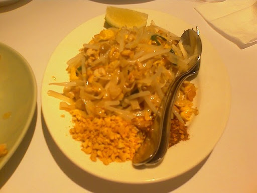 第二道上來的是泰式炒河粉。擠了檸檬後,努力把河粉跟另外兩樣的配料拌在一起,味道有點普通,沒有酸或是辣味,份量也中等。不論擺盤或是吃起來的味道,都跟之前在竹女後面吃的泰國餐廳很類似。
