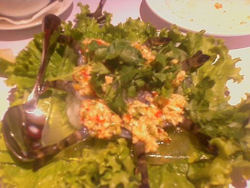 再來就是酸辣生蝦嚕!一共有七尾蝦子,如果我沒有記錯的話,每一尾蝦子去頭後,身體肉的部分被剖開,上面放滿了辛辣配料。一口把蝦子加著配料整個吃下去,蝦子的肉很彈Q,辛辣的配料把可能的腥味蓋住了,整個嘴巴會有點麻麻辣辣地,好吃阿!!感覺不論有多少尾,都可以吃下去。之前在金山街的南城,因為是吃到飽的泰國料理餐廳,每次都是狂點這道菜:P不過會覺得瓦城的排盤漂亮多了,而且蝦子好像也比較大些:P