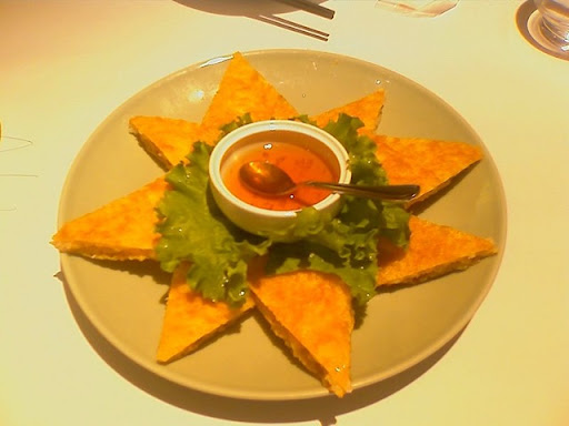上的第一道菜是月亮蝦餅。月亮蝦餅真的很厚,而且每一口都可以吃到滿滿的蝦肉,沾著類似酸梅味道的醬汁,真的是又酥又脆,厚厚的餅有著很棒的嚼勁,配著酸酸的味道,真的是一整個正點,好吃得不得了!!