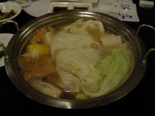 一照相,就看準了旁邊的湯匙,一種撈湯的,一種撈料的!我們點的是最便宜的雙人套餐,然後貼錢換了一個韓式海鮮餅!