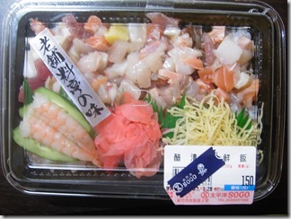 常常在想要吃生魚片蓋飯的時候,我都會忍到接近八點的時候,才來新竹SOGO地下二樓超市裡面,看一下有沒有正在特價的生魚片蓋飯。不過,今天買完新的褲子之後,太陽也才正要準備下山而已,就不想那麼多啦,直接買了醋漬海鮮飯(150)回家吃囉!