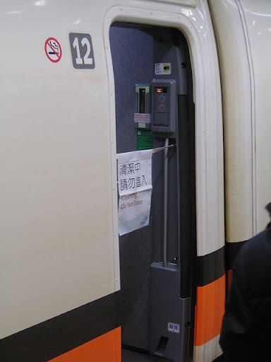 我下月台的時候,大概離開車時間還有二十分鐘吧。這時候列車已經停妥在月台邊了,不過似乎有清潔人員正在裡面進行打掃,而且在列車的門口,也掛著一個小小的告示:清潔中,請勿進入!