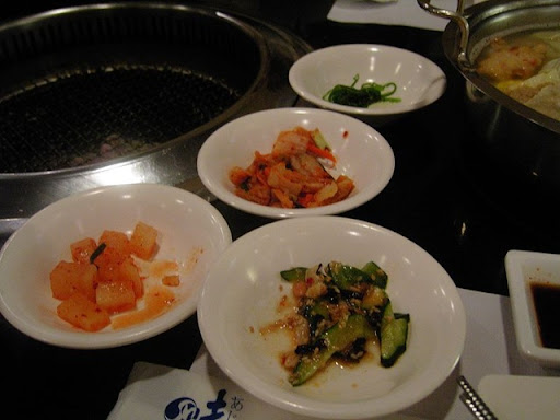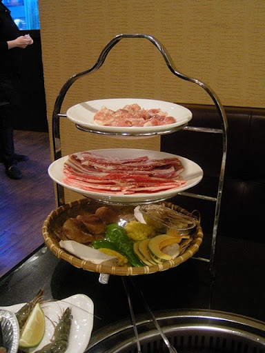 讓我覺得有趣的就是,燒烤的肉和菜類都是用金屬的架子疊起來地,分成三層。最上面的是雞肉,再來是豬肉跟牛肉,最下面一層是蔬菜。牛肉跟豬肉不錯吃,不會切得太厚,也有適當的油脂。雞肉的話,跟其他兩種肉類一樣,沒有事先醃過,同時店家也沒有提供豬油或是奶油之類,所以,雞肉會變的有點不太好烤。當然這也可能是我們技術太差了,最後都把雞肉烤得乾乾癟癟地@@