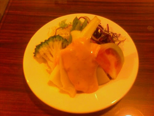 就在我們聊天的同時,服務人員幫我們先上了沙拉。我個人覺得這樣價錢的套餐,沙拉還挺豐盛的,我有吃到兩片「類似」鮑魚東西,只是我實能確定真假:XD,還有一些平常沙拉會有的蔬菜跟千島沙拉醬,排盤也還挺用心漂亮的!不過同行的一位朋友說,他的蕃茄有魚腥味>.<這個,我跟其他人恰好沒有吃出來!