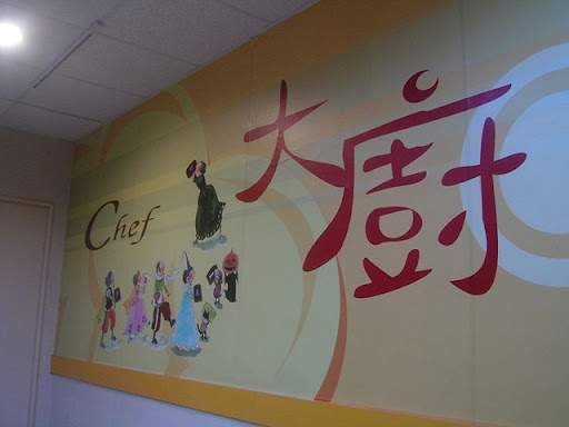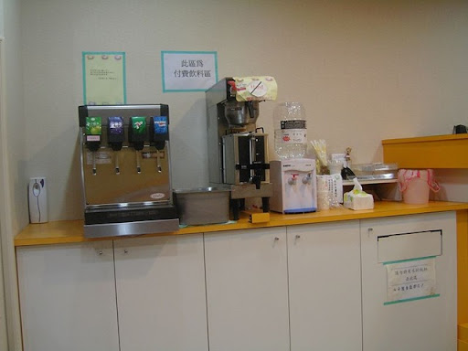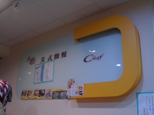 走進大廚店裡面,會覺得裝潢擺設相單簡單, 大概是六張桌子,一張桌子配著兩張椅子;一進門可以看到的是一個主要的櫃臺,肩負著點菜跟回收餐盤的功用;左手邊是下圖可見的料理台,主要是提供杯子、餐巾紙跟付費的飲料。