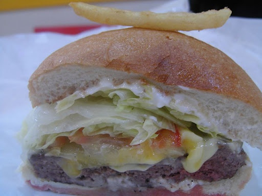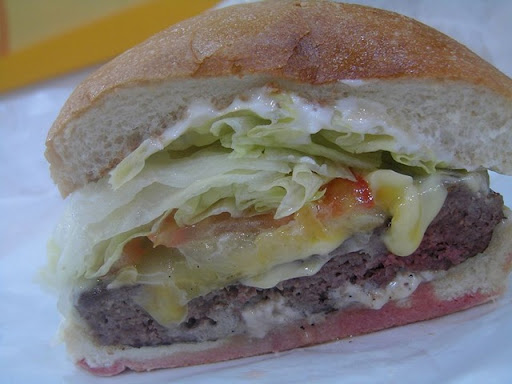 因為看起來好吃,忍不住就多拍了好多張,等我收了相機之後,雙手抓著麵包,張大嘴巴,大口的咬下去,香阿!不是鼻子聞到的那種香味,而是可以感覺到,牛肉在嘴巴裡面散開的香味!漢堡肉挺厚,外面稍微煎得比較熟,但是不會硬,而最中間的部分,漢堡肉的核心,還是粉紅色的,吃起來就是嫩嫩地啦!而底下的麵包,不知道是不是被血水滲過去,也變成了粉紅色的了,看起來就整個很嫩的樣子,會沒有自覺地加快了嘴巴咀嚼的速度,快速地把整個漢堡消滅掉,然後頂著個大大的肚子,滿足地微笑!