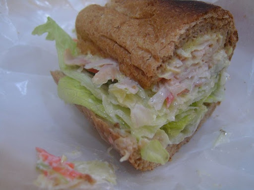 打開包裝之後,看到了裡面的東西,我第一個反應是麵包好焦喔,等等咬下去會不會硬到把牙齒弄斷阿!所以,我先吃了旁邊被擠出來的生菜,沒想到,這生菜是有味道的耶!!我的意思不是說生菜有菜味喔,而是這生菜有經過調味的,並且可以感覺到醬料與生菜整個攪拌很均勻,有點像是外面餐廳在賣的凱薩沙拉,生菜還有配料都跟醬汁完美地混合在一起。因為我只吃過subway有類似的餐點,所以就拿subway來比較一下囉!subway的菜跟配料還有醬汁吃起來感覺都像是單獨的個體,如果有菜或是配料掉出來,完全都是原本的味道,不像大廚,不只是有調味過,還非常的好吃咧!