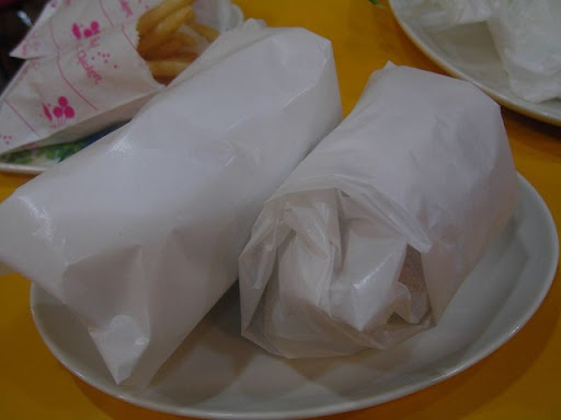 這一次我們點了蜂蜜芥末火雞肉(100)、大牛肉漢堡(160)跟馬玲薯湯(?)三樣。首先上菜的是切成兩半且已經包好的蜂蜜芥末火雞肉!