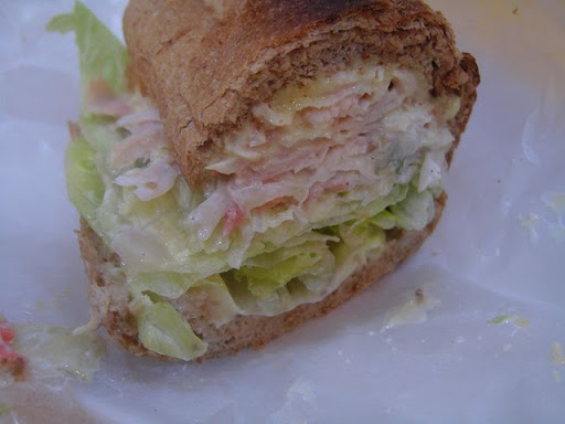 從側面好好觀察剖面圖,不難發現,麵包似乎只有薄薄的一圈,整個都被豐富的內餡給撐到鼓鼓地,稍微烤焦的麵包,跟清爽的內餡形成了完美的反差,誘動著客人的食慾阿!雖然整個麵包很大,但是我嘴巴更大,一口咬下去絕對不會是個問題,問題是在,這實在太好吃了,沒有時間細細品味咀嚼,就想要再吃下一口了!!麵包雖然看起來有點小硬,不過實際上咬下去,上下都會感受到外層麵包的Q,中間蔬菜的脆跟清爽,以及最裡面肉片小小的彈性。不太會像是subway,咬下去只能感受到單邊的醬汁或是蔬菜,而大廚的,可以讓整個嘴巴全面性地感受到麵包、生菜、配料跟醬汁的美味阿!