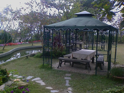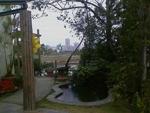 往外面的庭院走去,可以先看到一個很像是給人家烤肉用的棚子,後來恰巧在收銀台的地方,看到店家有介紹他們提供的BBQ服務,我想這邊的環境,有花有草真的挺適合來BBQ一下!