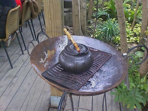 就在旁邊,店家怕客人在庭院用餐會冷,所以在兩個角落放了兩個應該是取暖用的盆子!其中一個還在上面放了個架子,剛好可以用碳的熱氣,保持茶壺裡面的水溫,真是不錯阿!