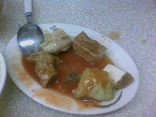 很令我訝異的是,這邊除了賣小菜之外,還有賣類似關東煮的東西耶!坐定位,個別點了一碗意麵、湯意麵、跟一碗乾麵之後,我就跑去前面點了一些小菜,有豆腐、高麗菜捲、黑輪跟一盤筍絲。我個人覺得豆腐沒有啥味道,黑輪還OK,高麗菜捲的話裡面都是魚漿囉,筍絲的話,除了很油跟黃色這兩點讓我覺得他像是筍絲外,吃起來不酸也沒有筍味阿!